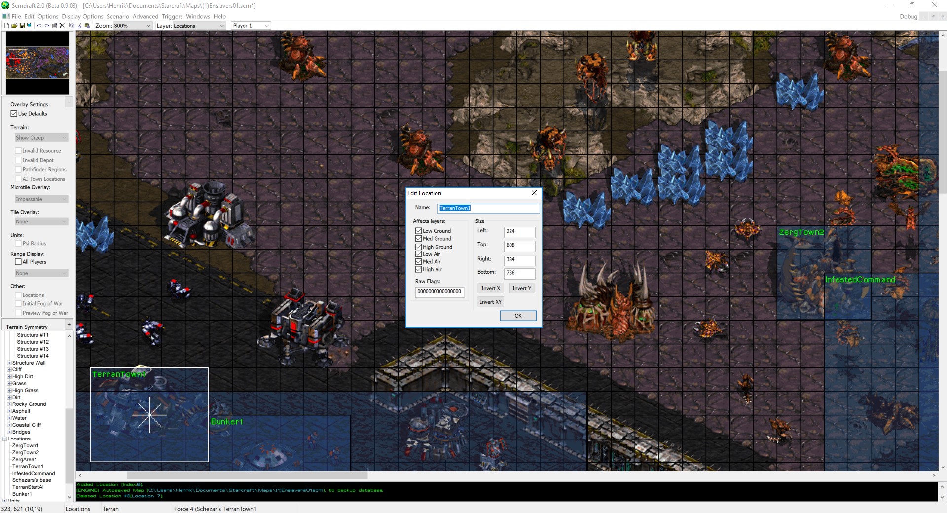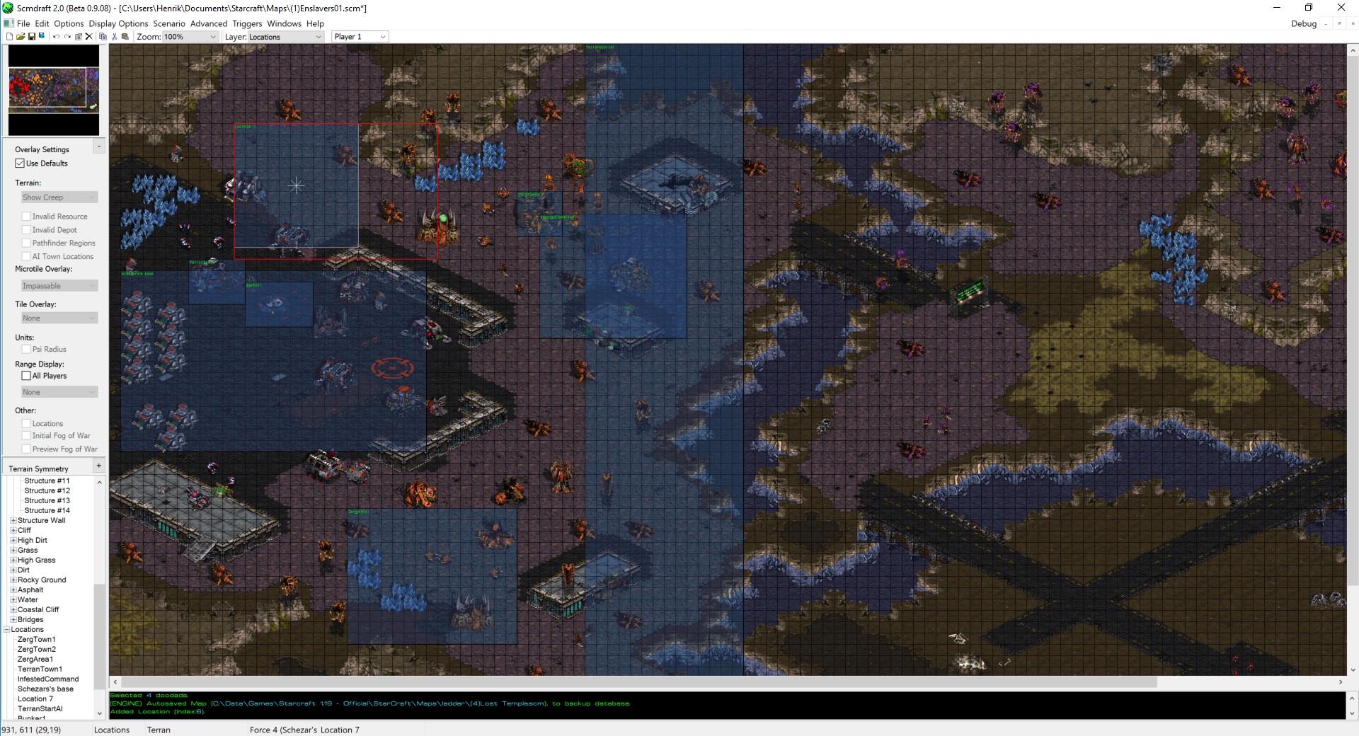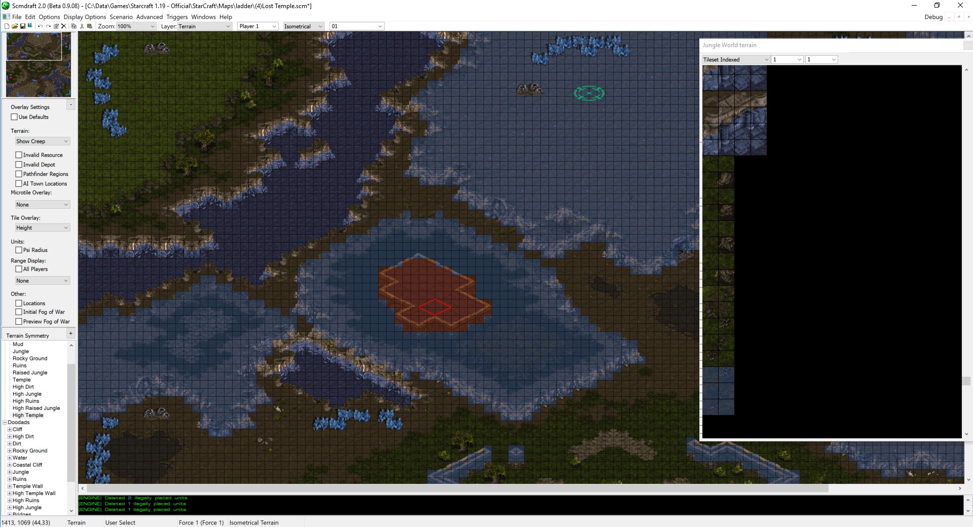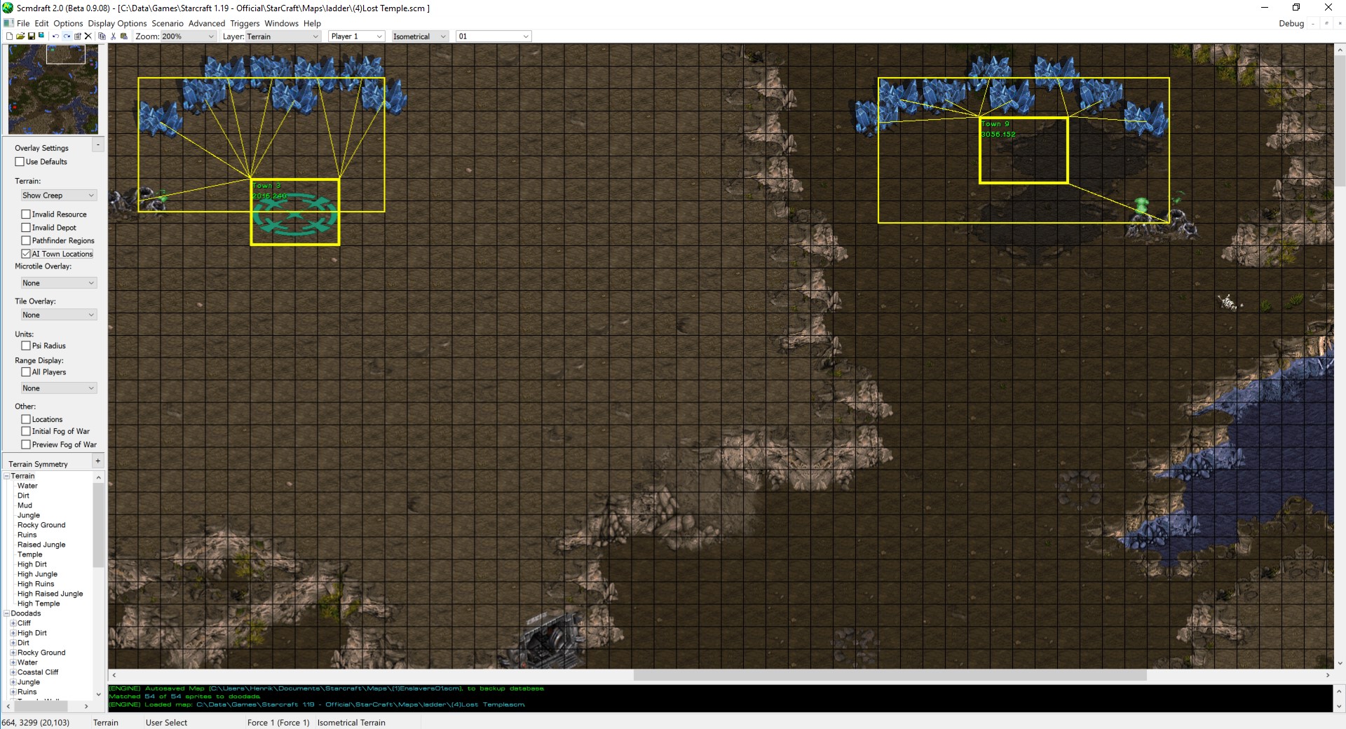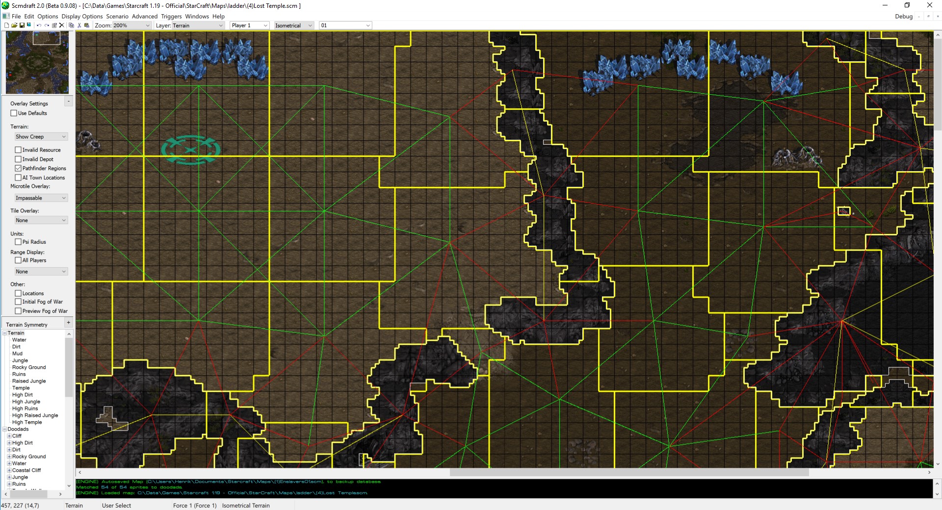Building Placability Viewing which areas of the map may have buildings placed on them. The option is available in the 'overlays' panel on the left of the editor. The terrain palette also is displaying this information. This is automatically enabled when placing buildings  Tile Height Viewing the height of each tile within the map. The option is available in the 'overlays' panel on the left of the editor. The terrain palette also is displaying this information.  Microtile Height Viewing the height of each microtile. (Each tile consists of 4 x 4 microtiles, each of which is 8 x 8 pixels in size.) The terrain palette also is displaying this information  Unit movement Viewing where units may move on the map. (Each tile consists of 4 x 4 microtiles, each of which is 8 x 8 pixels in size.) The terrain palette also is displaying this information  Pathing Preview Advanced Feature: Preview of the pathfinder regions, which are used by the game internally to determine how units move from point to point. Each region is outlined in yellow, with green lines connecting adjacent regions that the game considers connected, and red lines connecting regions that the game considers disjoint. Additionally the border between pathable and unpathable is displayed with a thin white outline.  Pathing Preview Advanced Feature: Preview of the pathfinder regions, which are used by the game internally to determine how units move from point to point. Each region is outlined in yellow, with green lines connecting adjacent regions that the game considers connected, and red lines connecting regions that the game considers disjoint. Additionally the border between pathable and unpathable is displayed with a thin white outline.  AI Town Areas Advanced Feature: Preview of thw town areas. These are areas the AI considers as a potential expansion site, with the center marked as well as an outline of all the mineral and gas sources which are included in the site.