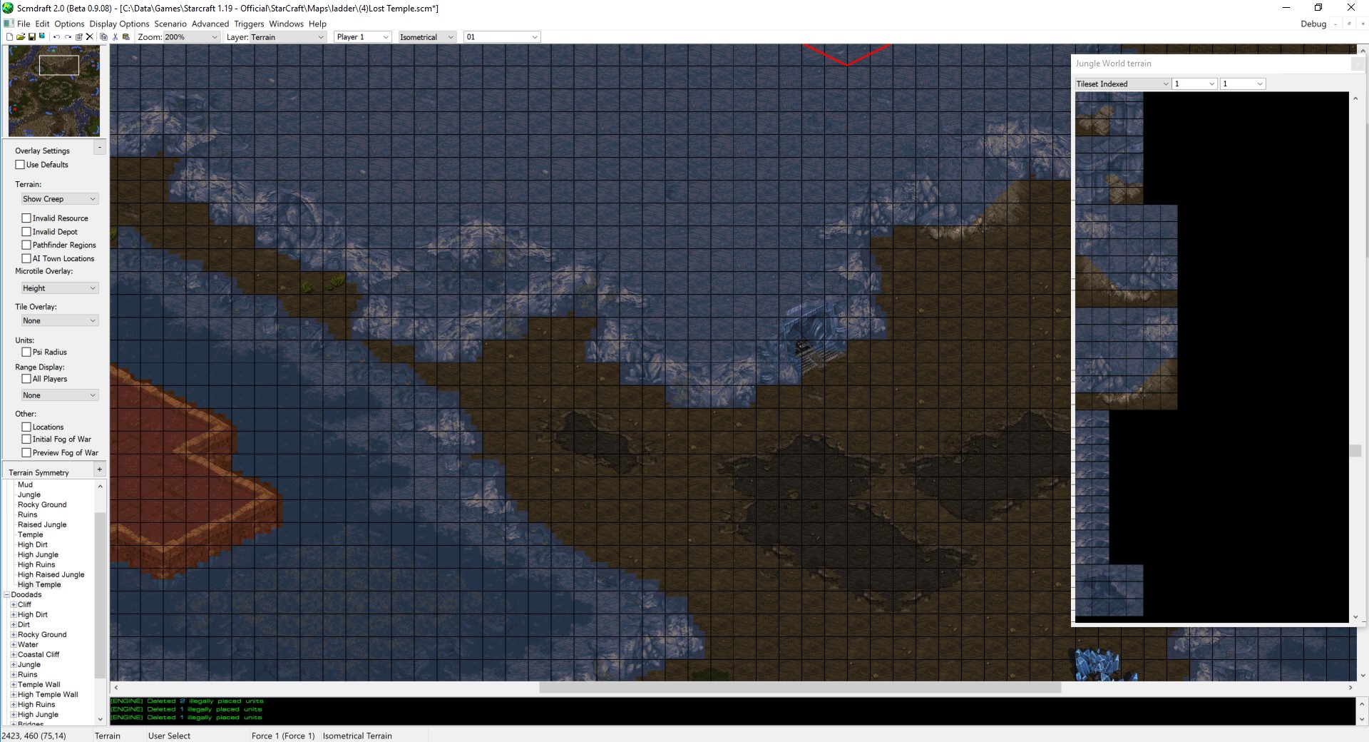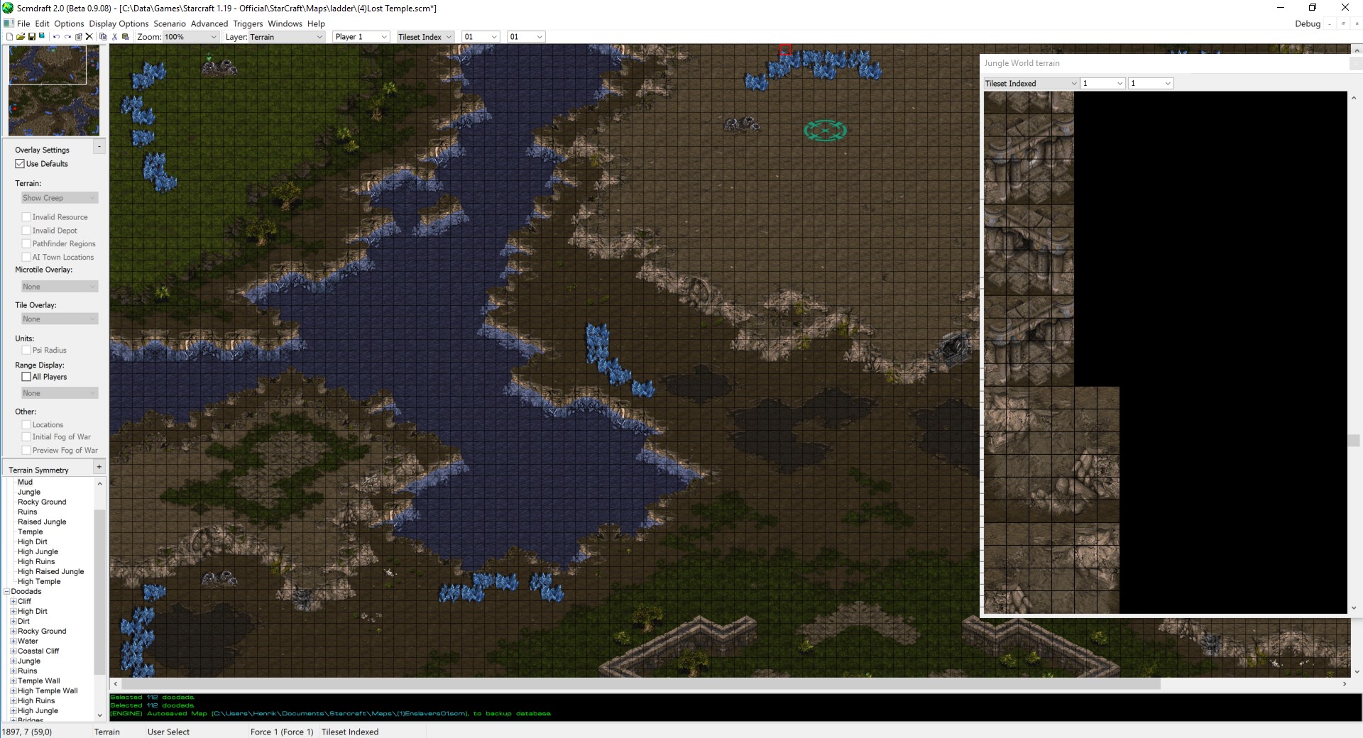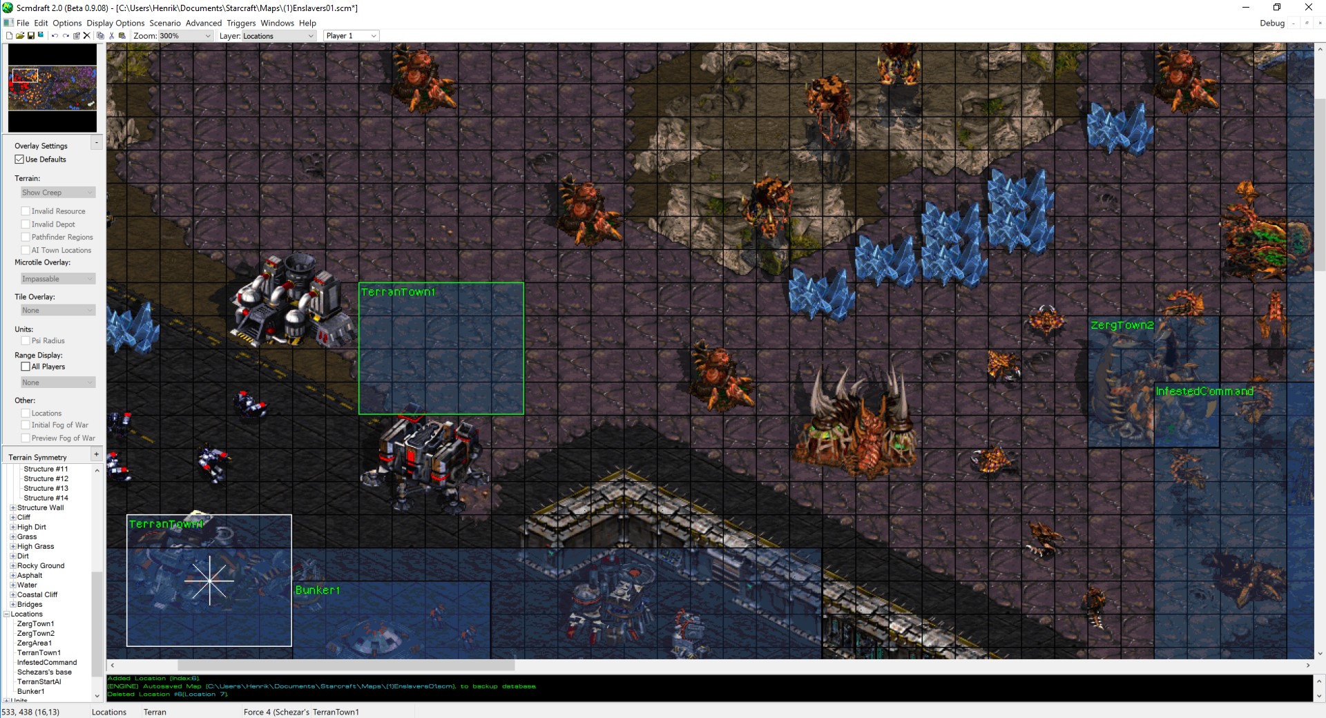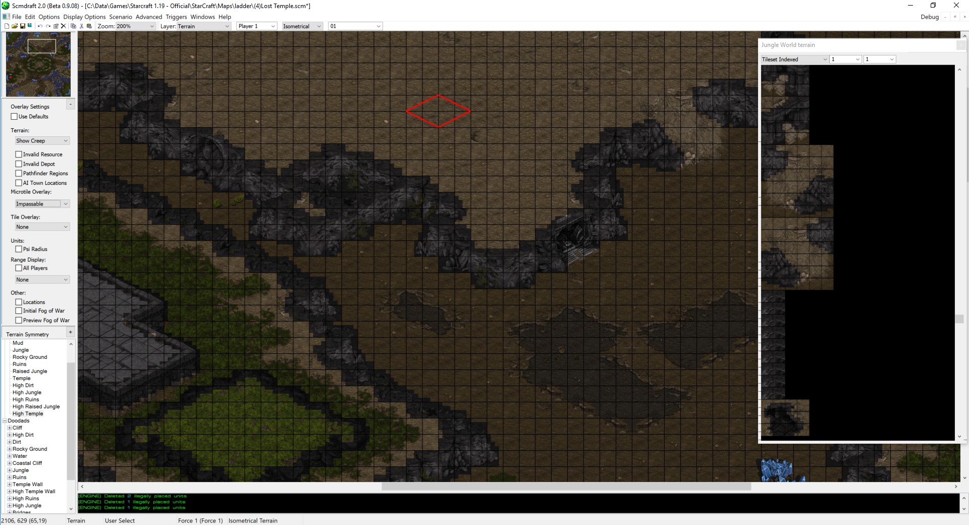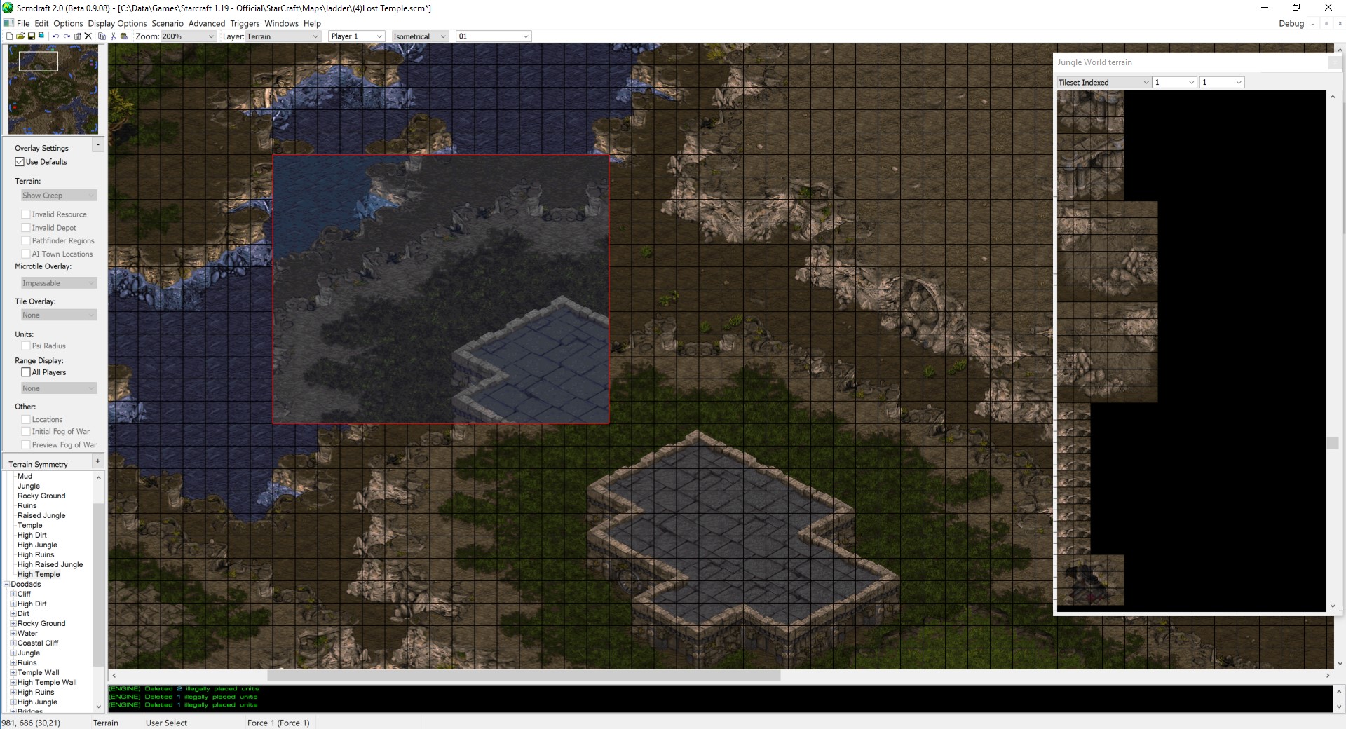 Building Placability Viewing which areas of the map may have buildings placed on them. The option is available in the 'overlays' panel on the left of the editor. The terrain palette also is displaying this information. This is automatically enabled when placing buildings  Tile Height Viewing the height of each tile within the map. The option is available in the 'overlays' panel on the left of the editor. The terrain palette also is displaying this information.  Microtile Height Viewing the height of each microtile. (Each tile consists of 4 x 4 microtiles, each of which is 8 x 8 pixels in size.) The terrain palette also is displaying this information  Unit movement Viewing where units may move on the map. (Each tile consists of 4 x 4 microtiles, each of which is 8 x 8 pixels in size.) The terrain palette also is displaying this information  Pathing Preview Advanced Feature: Preview of the pathfinder regions, which are used by the game internally to determine how units move from point to point. Each region is outlined in yellow, with green lines connecting adjacent regions that the game considers connected, and red lines connecting regions that the game considers disjoint. Additionally the border between pathable and unpathable is displayed with a thin white outline.  Pathing Preview Advanced Feature: Preview of the pathfinder regions, which are used by the game internally to determine how units move from point to point. Each region is outlined in yellow, with green lines connecting adjacent regions that the game considers connected, and red lines connecting regions that the game considers disjoint. Additionally the border between pathable and unpathable is displayed with a thin white outline.  AI Town Areas Advanced Feature: Preview of thw town areas. These are areas the AI considers as a potential expansion site, with the center marked as well as an outline of all the mineral and gas sources which are included in the site.