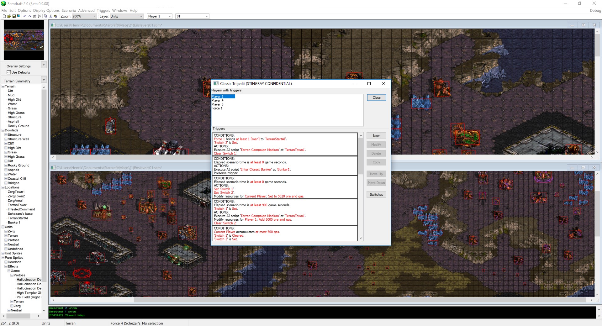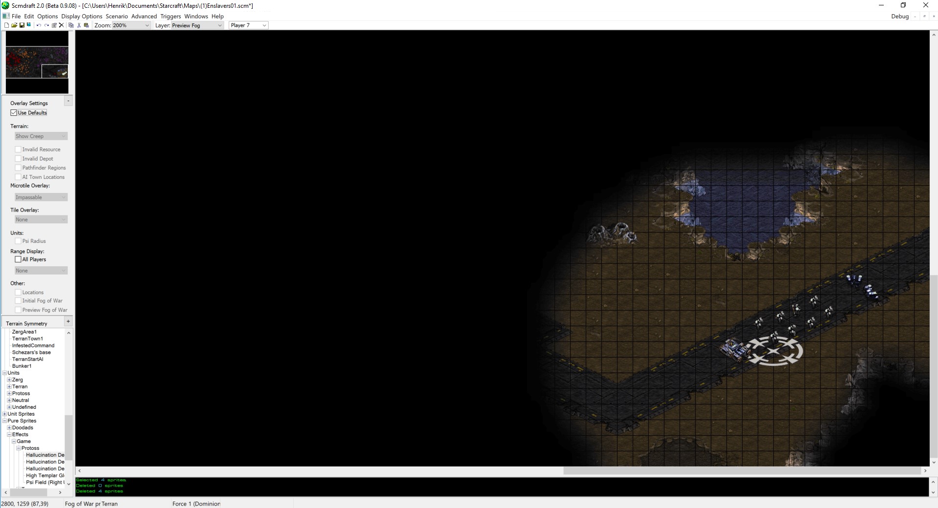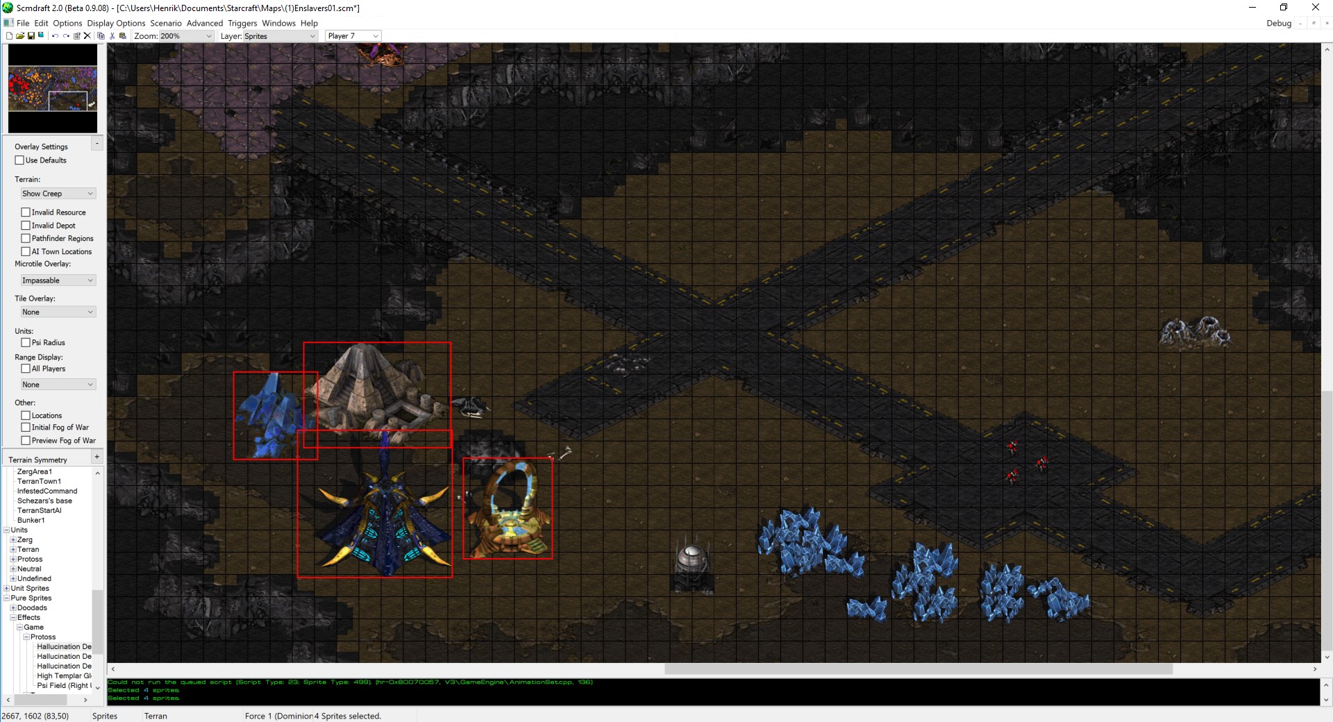 Adding sprites Adding unit sprites and pure sprites to a map. These may be selected using the sprite palette (not shown) or the sprite portion of the object tree at the bottom left.  Selecting sprites Selecting multiple sprites in preparation for copy + paste or deletion.