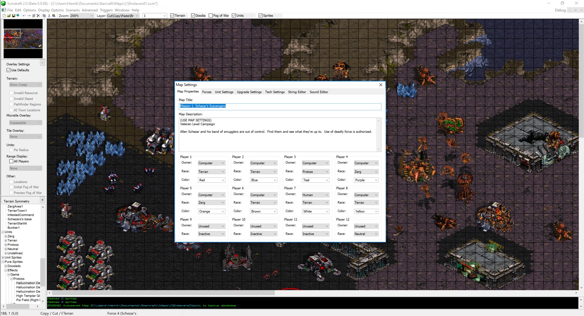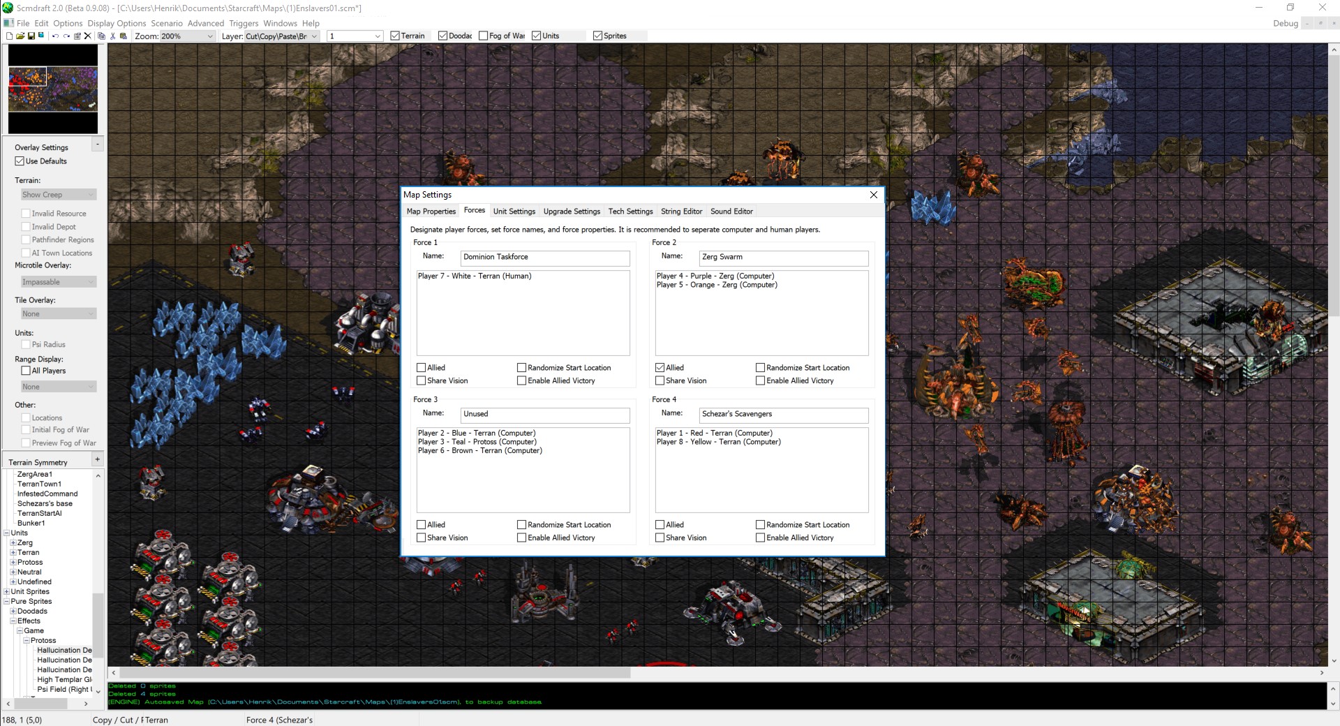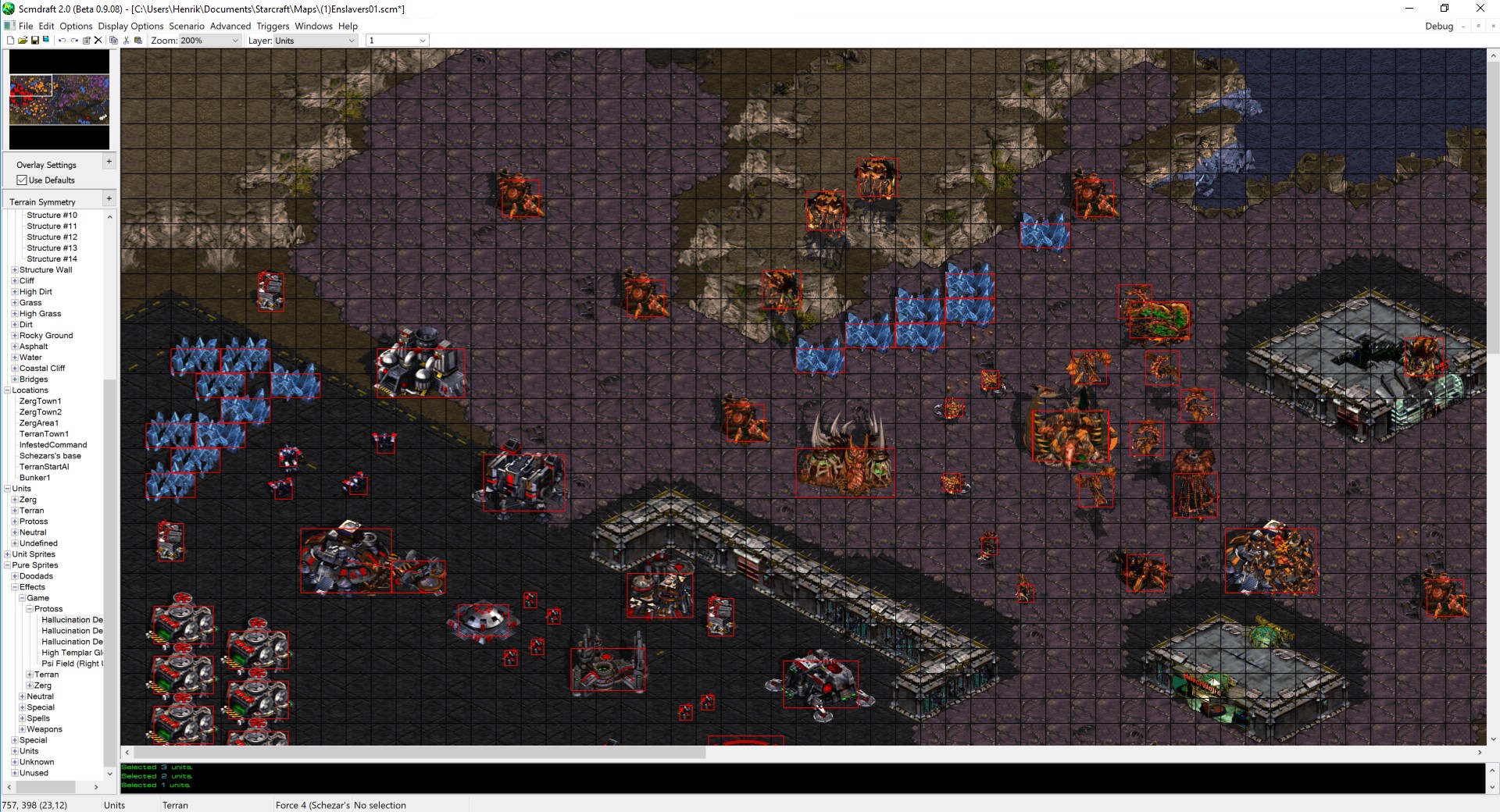Adding sprites Adding unit sprites and pure sprites to a map. These may be selected using the sprite palette (not shown) or the sprite portion of the object tree at the bottom left.  Selecting sprites Selecting multiple sprites in preparation for copy + paste or deletion.