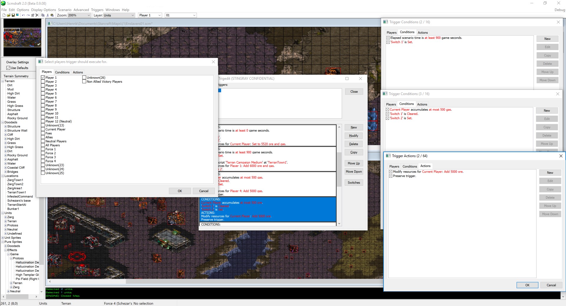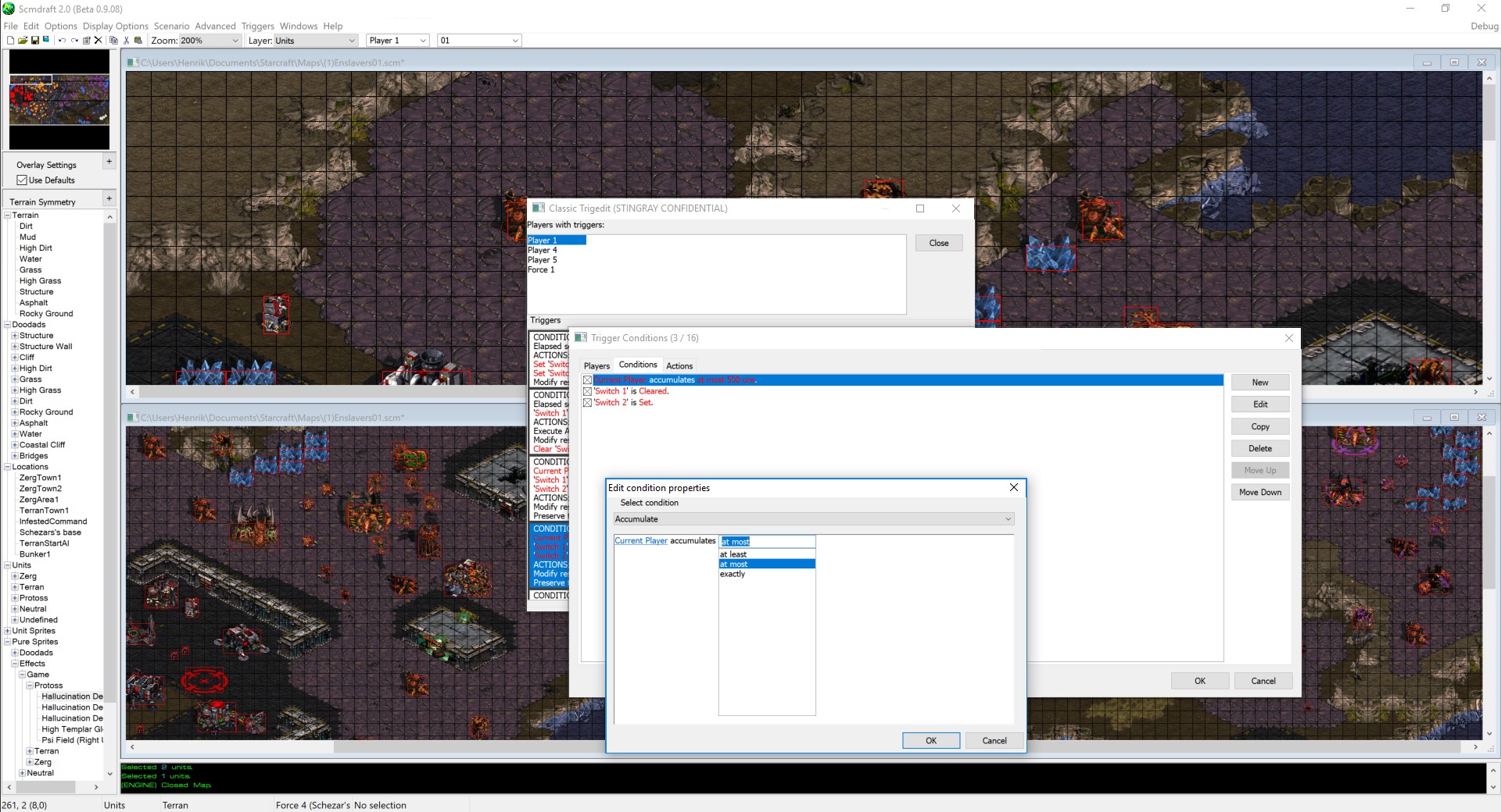 Main window Main classic trigedit window. Select players to filter which triggers are shown.  Trigger Window Editing multiple triggers at once.  Condition Window Editing a single condition of a trigger.