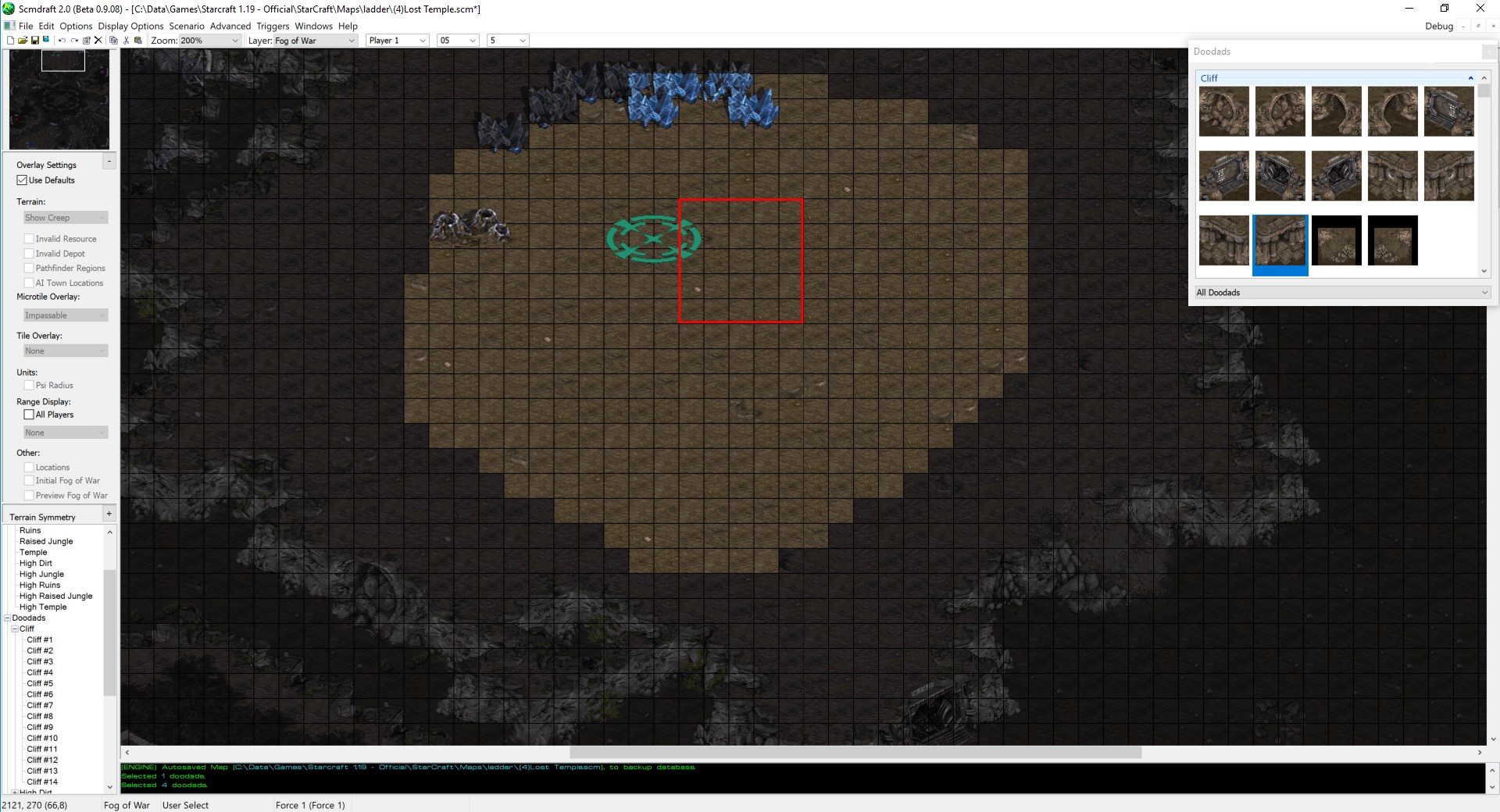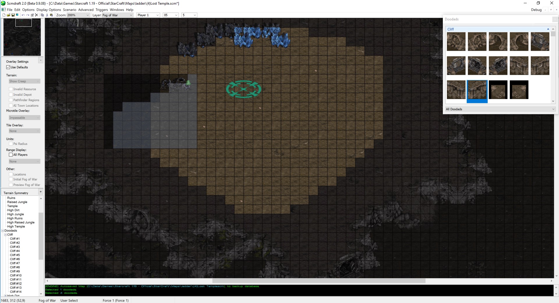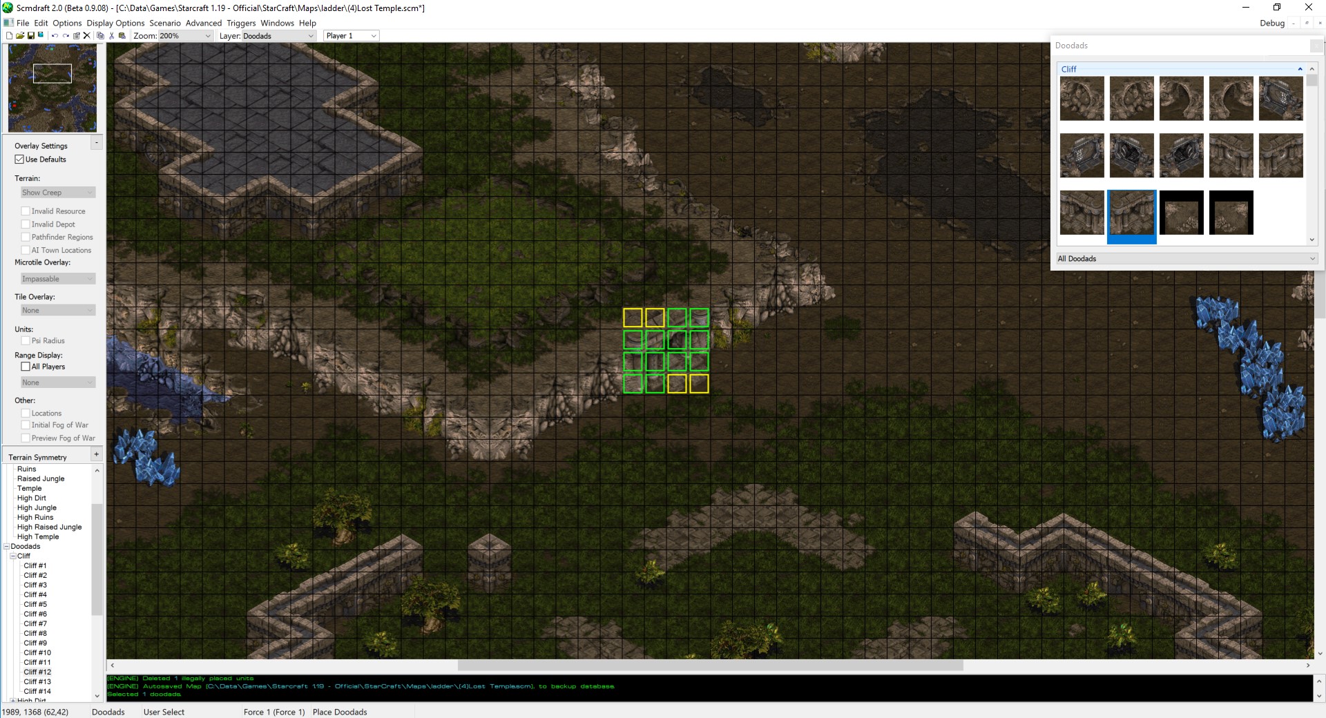Placing Doodads Placing a doodad, selected from the floating doodad palette (top right, accessible via the windows menu)), or the doodad sub tree in the object tree (bottom left). Green outlines represent terrain which matches the doodad requirements, yellow (or red) outlines represent terrain which is not appropriate for the doodad. The 'Place Doodads Anywhere' option enables or disables this terrain check.  Selecting Doodads Selecting multiple doodads in preparation for copy + paste or deletion.  Pasting Doodads Placing multiple doodads.