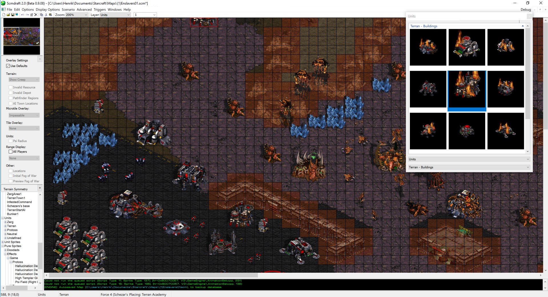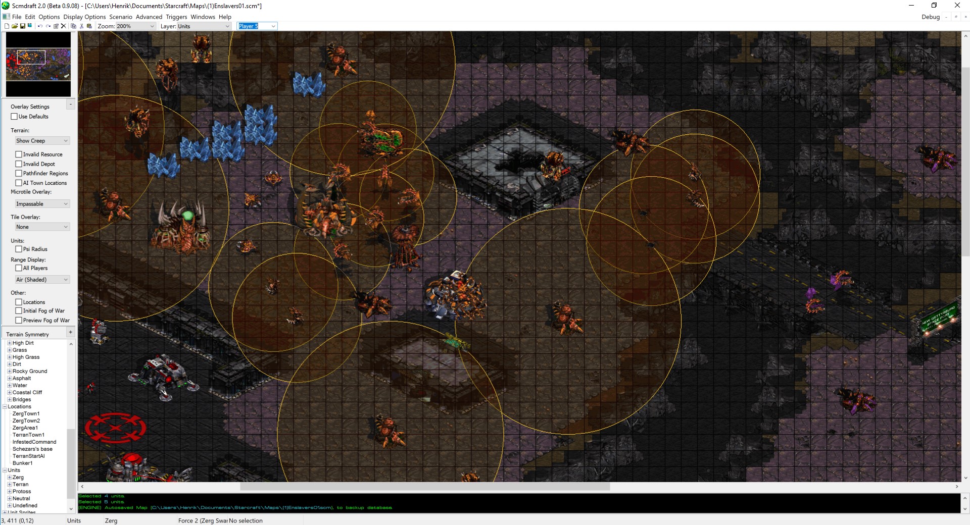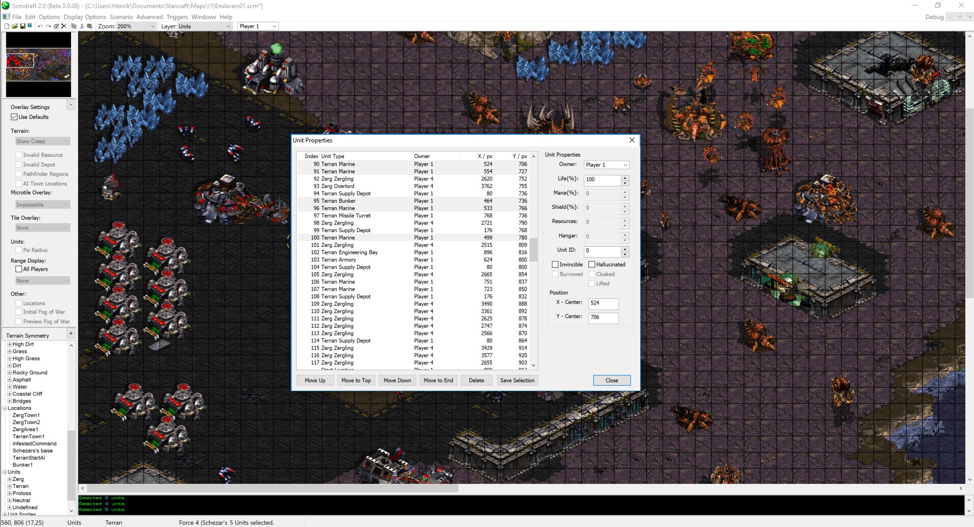 Unit Selection Selecting multiple units in preparation for copy + paste or deletion.  Placing Resource Depots Placing a command center with comsat station. The ares which are too close to mineral sources to allow valid placement are displayed in bright red, while areas where buildings may not be placed are displayed in light red.  Placing Units Placing multiple units, in this case SCVs.  Selecting brush unit Selecting a building for placement using the unit palette (Accessible via the windows menu).  Unit Properties Changing the unit properties of the selected units. The selection in the dialog is shown on the map with yellow selection circles.  Unit Collision Boxes Displaying unit collision boxes, used for pathing and wall-ins. This option is available in the debug menu at the top right.  Unit Overlays Display of an approximation of the air attack range of player 5's units, with shading.  Unit Overlays Display of an approximation of the ground attack range of player 5's units, without shading.  Unit Animations All units are animated, such as the optional death animations for units removed from the map.