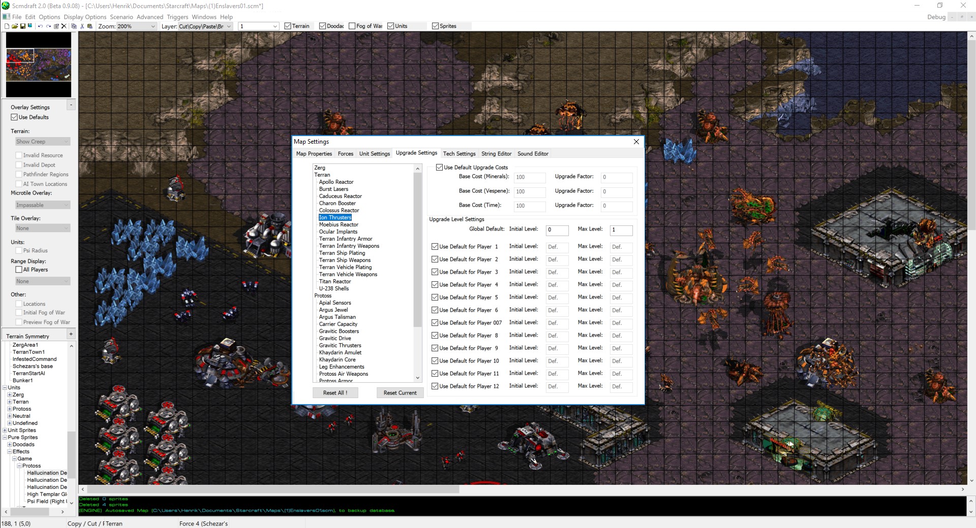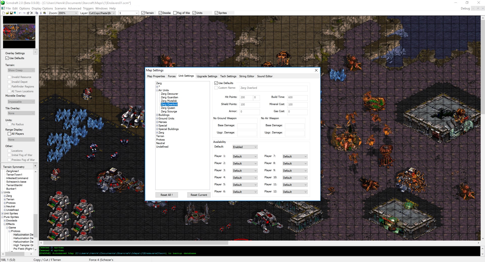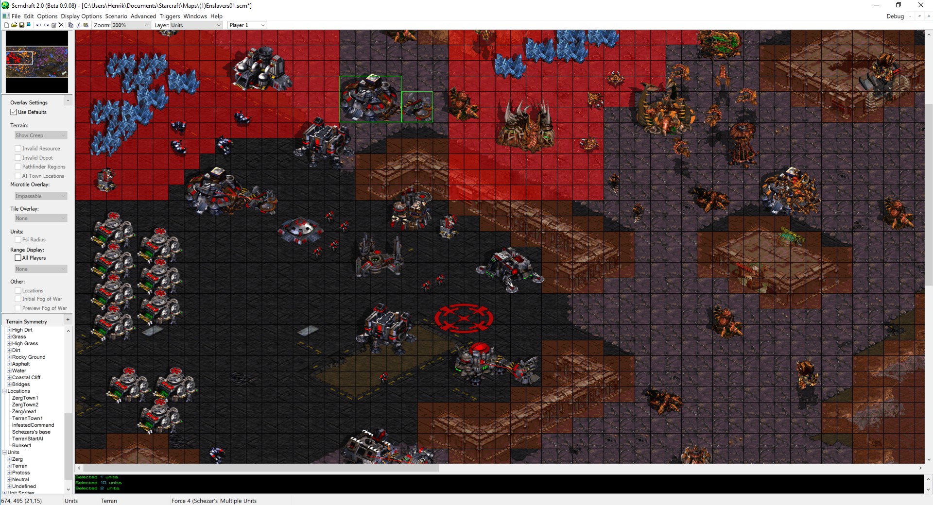 Unit Selection Selecting multiple units in preparation for copy + paste or deletion.  Placing Resource Depots Placing a command center with comsat station. The ares which are too close to mineral sources to allow valid placement are displayed in bright red, while areas where buildings may not be placed are displayed in light red.  Placing Units Placing multiple units, in this case SCVs.  Selecting brush unit Selecting a building for placement using the unit palette (Accessible via the windows menu).  Unit Properties Changing the unit properties of the selected units. The selection in the dialog is shown on the map with yellow selection circles.  Unit Collision Boxes Displaying unit collision boxes, used for pathing and wall-ins. This option is available in the debug menu at the top right.  Unit Overlays Display of an approximation of the air attack range of player 5's units, with shading.  Unit Overlays Display of an approximation of the ground attack range of player 5's units, without shading.  Unit Animations All units are animated, such as the optional death animations for units removed from the map.