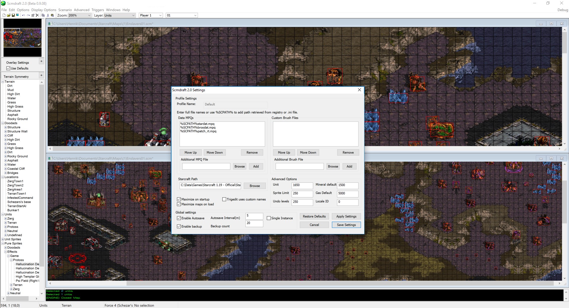 Basic Settings Editing basic map settings such as the title, description, and player properties.  Force Settings Editing the force names, settings, and contents.  Unit Settings Editing the map's custom unit settings, such as names.  Upgrade Settings Editing the map's custom upgrade settings.  Technology Settings Editing the map's custom technology settings.  Map Strings (Text) Editing individual text strings which are in use in the map, including changing text colors. The view may be filtered to quickly find a specific string.  Map Sounds (wavs) Managing custom sounds imported into the map, and virtual sounds which are sounds which reference game data but do not take up space in the map.
